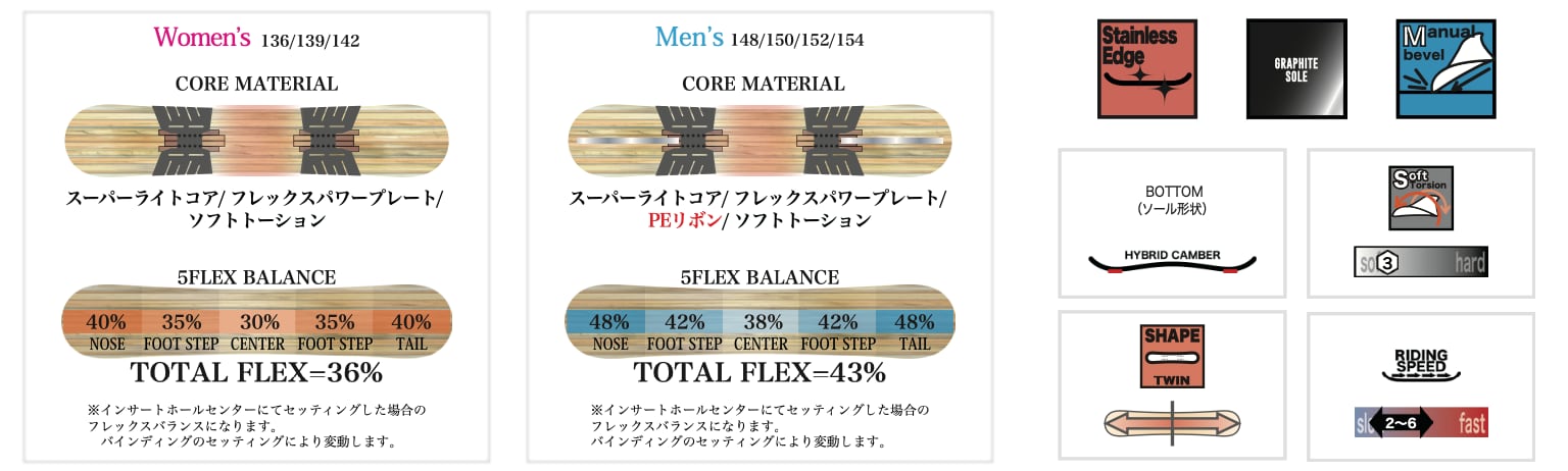 従来のグラスリボンからPEリボンへ変更することで、 フレックス(硬さ)自体は変えずに、粘りと反発を大幅に強化。 加重からの戻りが最適化され、板全体がより軽く、俊敏に感じられます。
